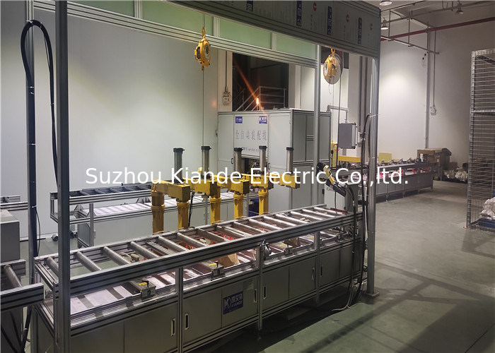 La chaîne de production automatique de barre omnibus se compose de trois parts, alimentant plaçant la station, la station d'inspection et la station de décharge. Quand la barre omnibus entre dans la position de alimentation, le système de contrôle choisira le bon montage de essai pour démarrer examiner de l'information identifiée par code barres ou chaîne de montage précédente. Trois essais seront réalisés comprenant la HT résistant à l'essai, à l'essai de résistance d'isolation et à l'essai au sol. Après que l'essai soit fini, le rapport des essais sera produit.
